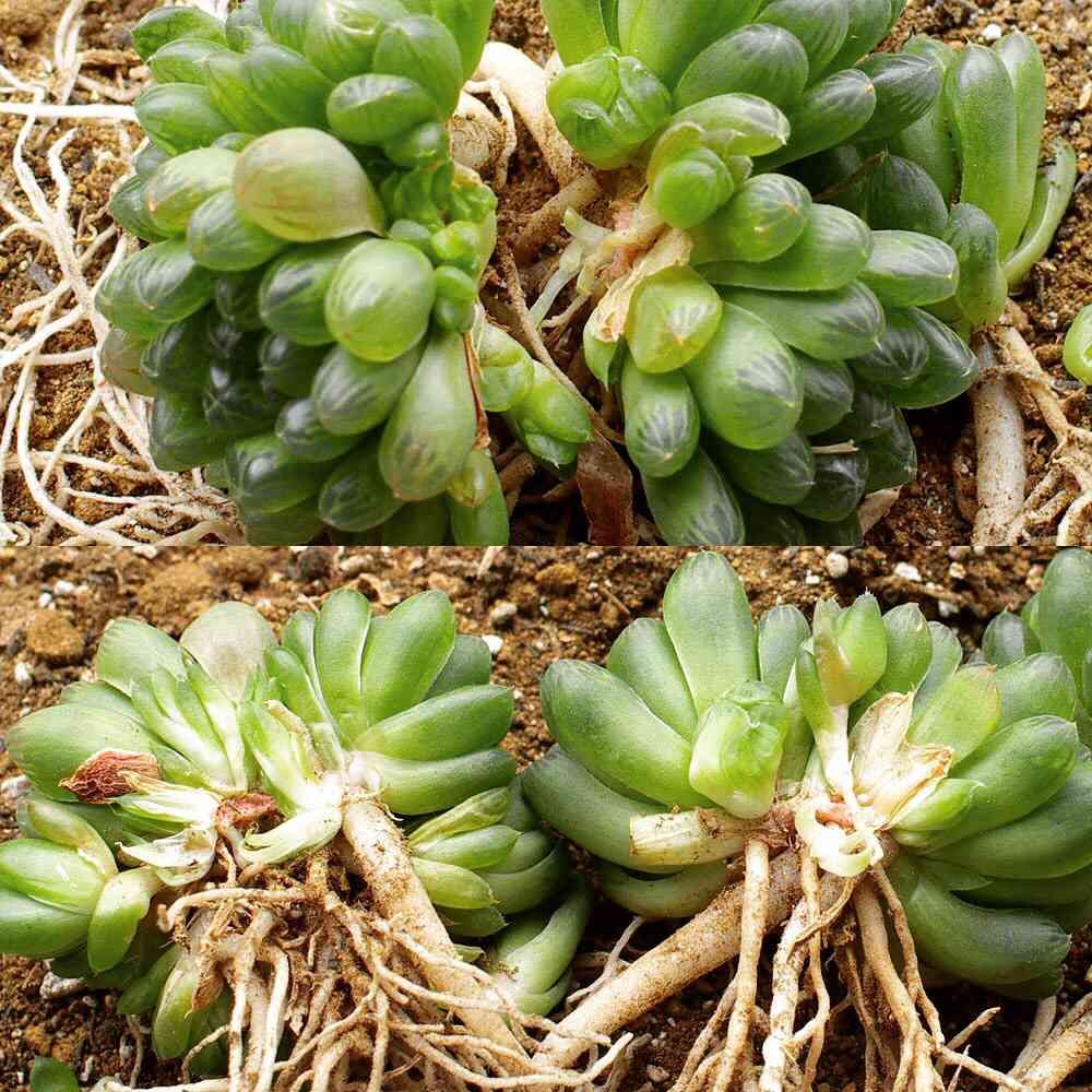 思ってたんとちょっと違って、1本どーんと幹が通ってる、という感じではなく、同じ大きさの独立した株がいくつも寄せ合わさって、互いに持ち上げあってこんもりボール状になっている感じ。「独立した」と言っても本当に独立してるわけではなくてちょっとくっついてます。でも簡単にプチっと取れる。こんな感じで、脇芽を出してはそれがほとんど独立して大きくなるので場所を取り合い、結果同じ大きさの株が量産されて1個1個は大きくならない。そんなモコモコ大家族にするか、定期的にバラして(子株をよけて)大きくするかは、『好みによる』かと思います!(*´ω`*)