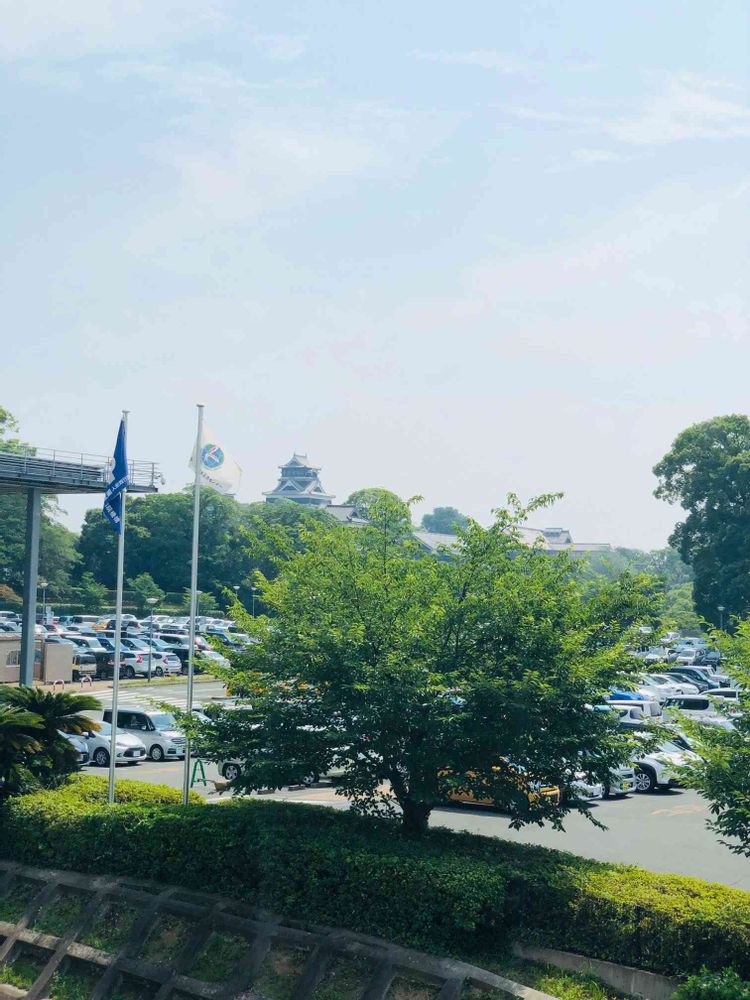 熊本城の緑の大木に囲まれたお城を見ながら、待っているところ。