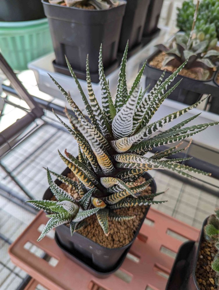 ハオルチアの十二の巻です。徒長気味で子株出てきて植え替えの順番待ちです。
