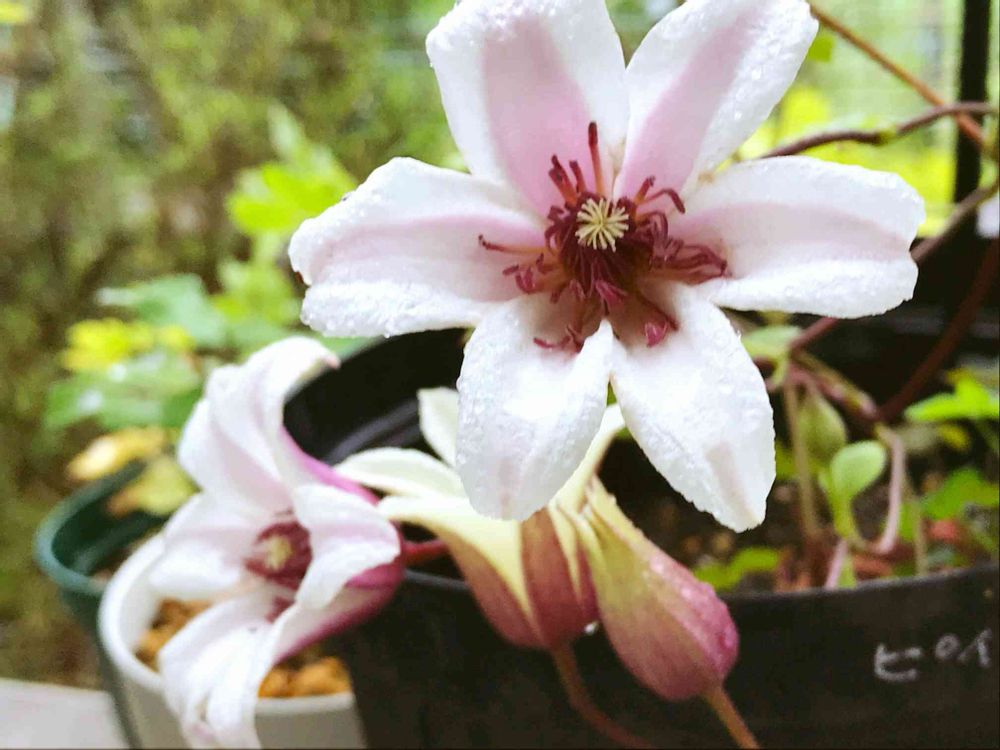 さん 可愛いですよ❤️新枝咲きで管理もしやすくオススメです😊❣️ つぼみの時は紫、咲いたら中は白でシベはピンクなのでいろんな面で楽しめます🎶