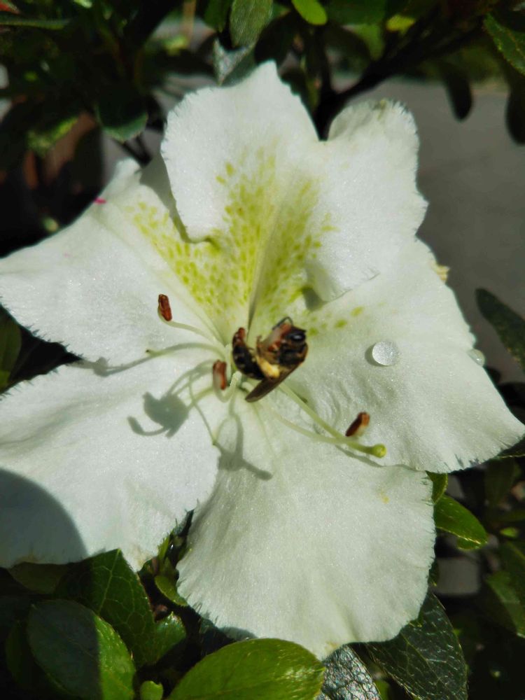 <地道投稿・師匠預投稿>朝から暑い☀️😵💦朝方「さつき に蜂🐝」あまりにも美味しいから、🌀🌀雌しべから離れない、20枚撮影したが、「蜂」🐝まともに撮ったのこれだけ。そ〰️言えば小学校低学年の時🤔😶約六十年前、さつき?ツツジ?の花採り、吸った記憶あります、確かに甘かった。げんこつ祖父からもらったな😨