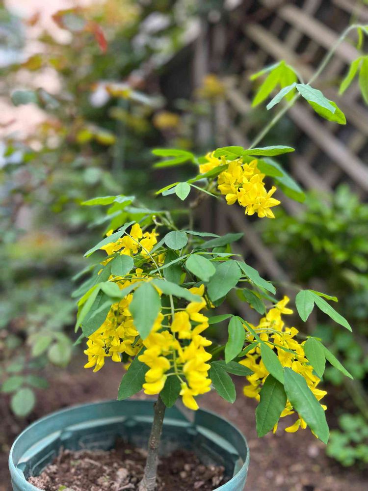 去年小さい苗から育ててたキングサリ💛💛咲きました〜🥰藤棚みたいに仕立てると見応えあるんだろうね〜