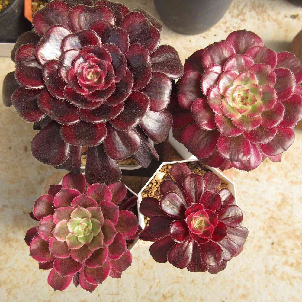 左上、黒法師錦も黒くなってやや平らになるけど中心の色合いが違うかなと