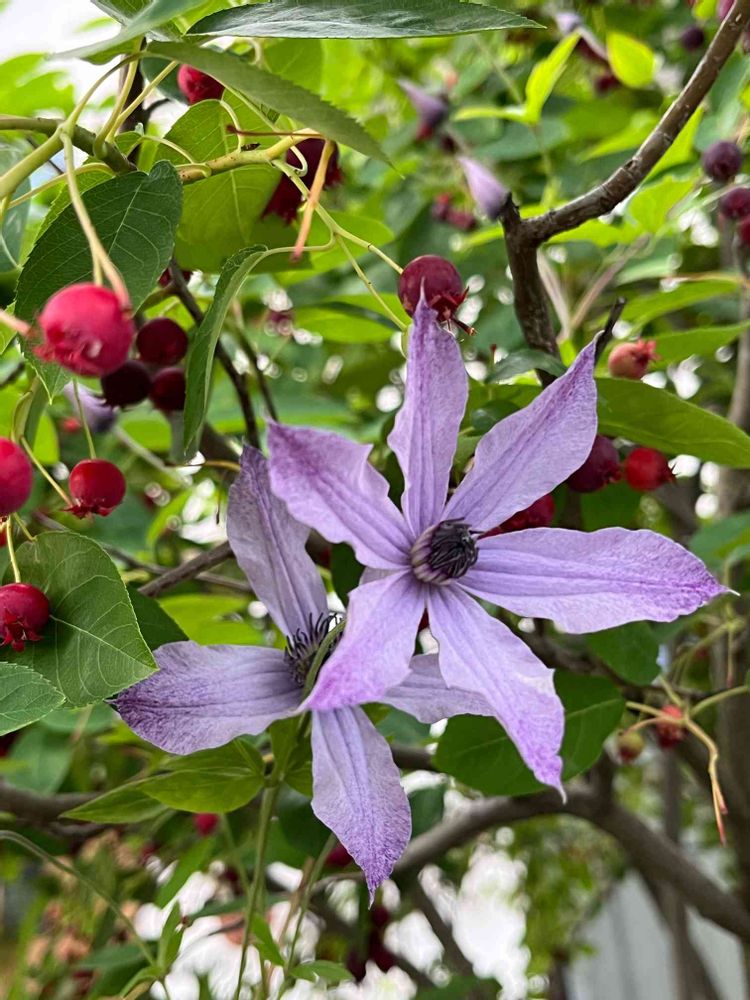 クレマチス・流星💠と真っ赤なジューンベリーの実🍒