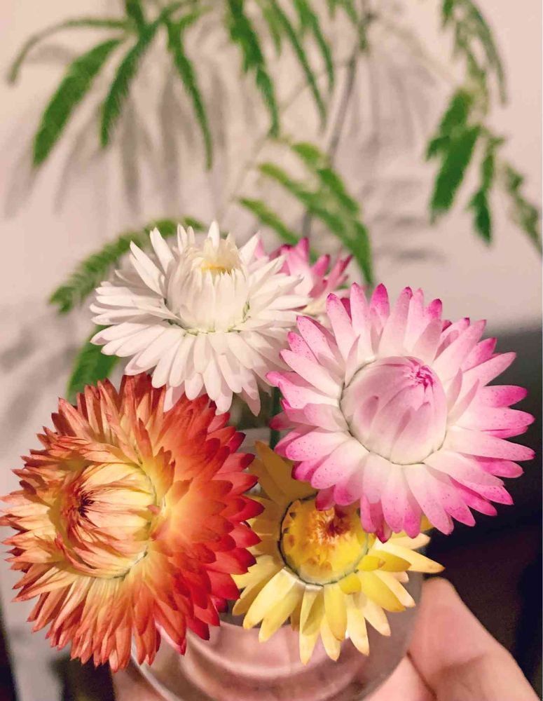 ヘリクリサム、いっぱい咲き出しました💘ちょうどよい咲き具合で収穫したのですが、、、明るいところに置いたからか⁉️真ん中が開いてしまって😂