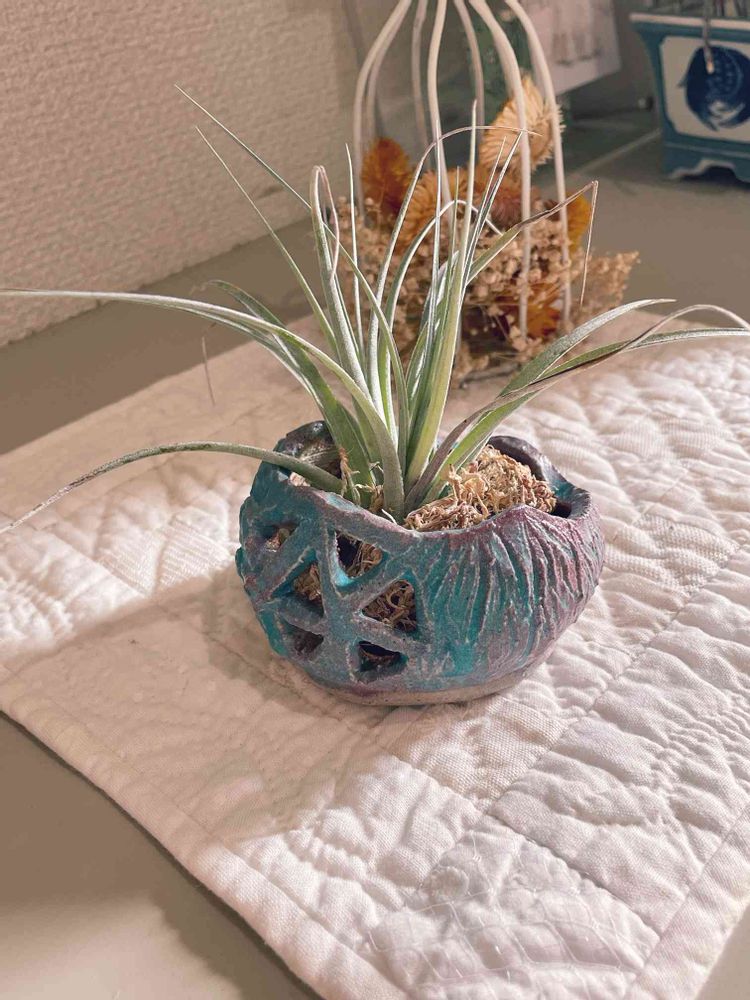 背面にも穴を開けて作ったのでとりあえずエアプランツ入れてあります