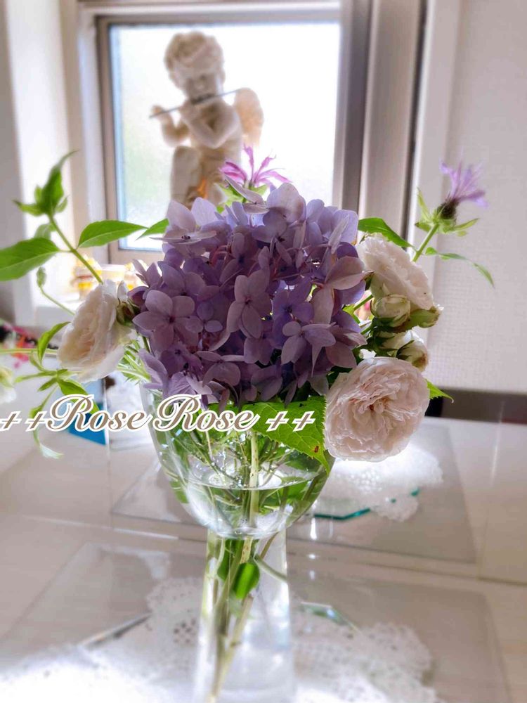 ベルガモット、紫陽花、フンショウロウ🌹でガラスベースで爽やかなアレンジ💐✨