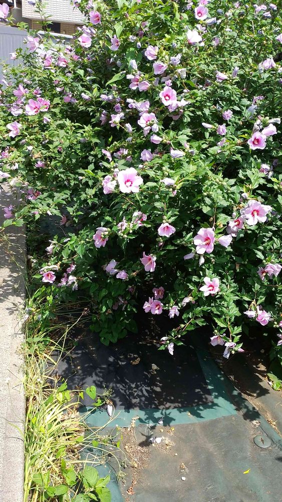 水路(今は暗渠)脇の隙間から生えてきたムクゲ、年々大きくなって沢山咲いています