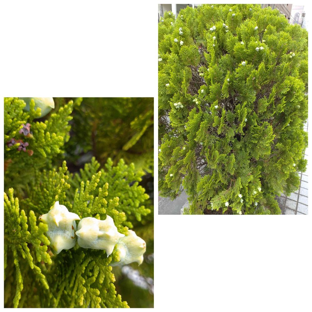 調べてみたら、コノテガシワ(児の手柏)という木で、白い金平糖のようなものはその実(球果)という事が分かりました。面白いです😆