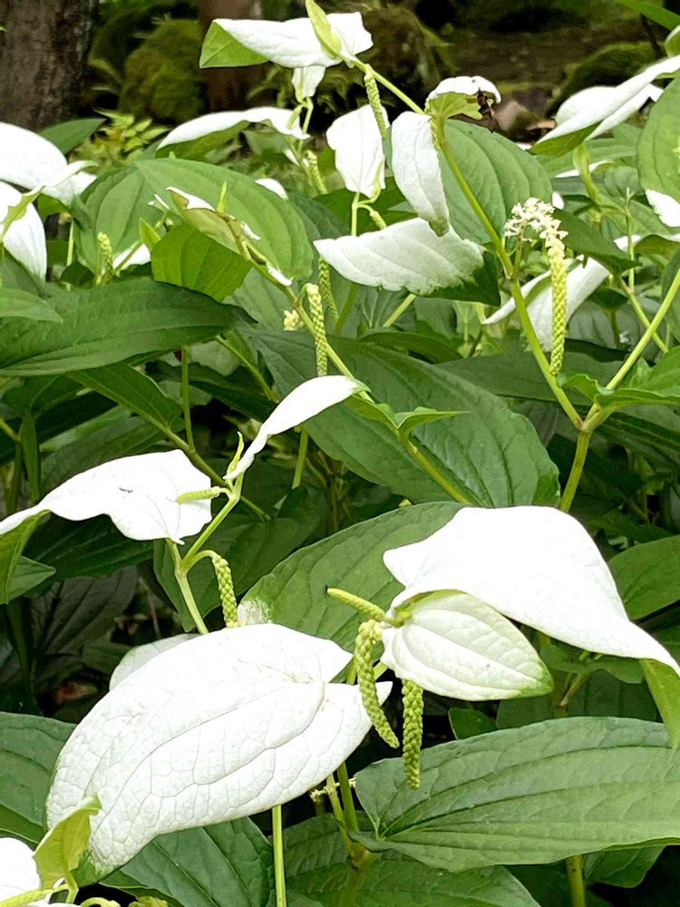 花が咲き終わって夏の盛りになると白い葉の白い部分は色落ちして普通の緑色っぽくなる