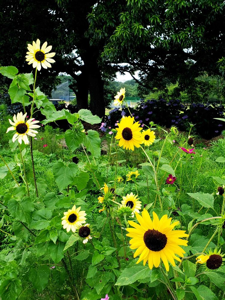 近くの運動公園の花壇の向日葵が、元気に咲いていました。🌻