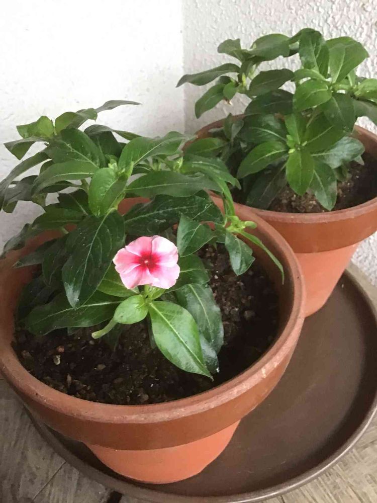 ニチニチソウ、 大鉢に 入り切らなかった 2苗は、1 つずつ 素焼き鉢に 植える事に なりました。。。