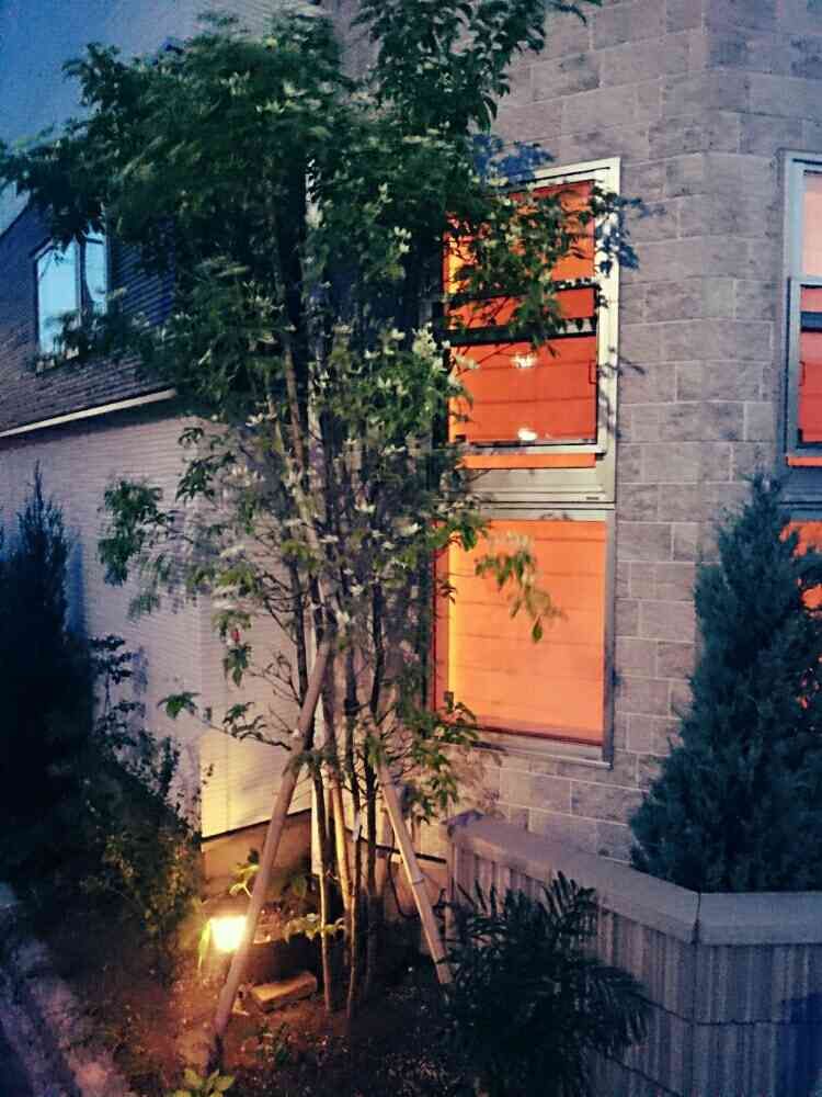 アプローチ側シンボルツリーのヤマボウシ、日没。