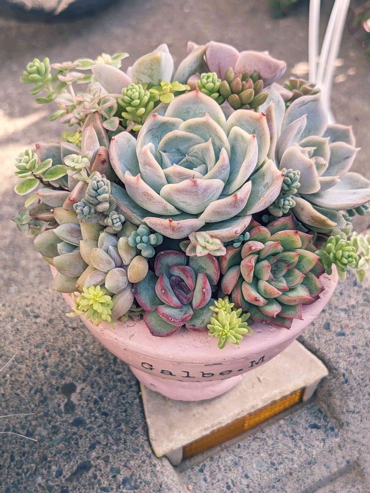 うっひょーーーどうやったら、こんなにもっこり可愛い寄植えができるんだろう?裏側もかわいいよねぇ?360度魅力的ーーうんうんもっと可愛い色になるなんてーーーー♥♥楽しみですねぇーーしかし。この状態でも満足じゃあーーー😋