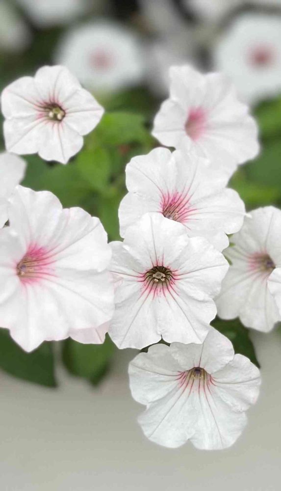 真っ白な花弁に花芯のピンクが差し色で優しく癒してくれるペチュニアです。