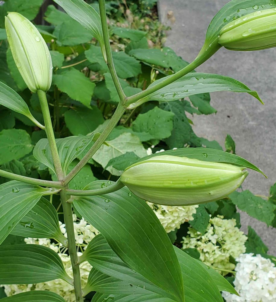 後ろのアナベル…ユリの蕾の色と似ているでしょ♡