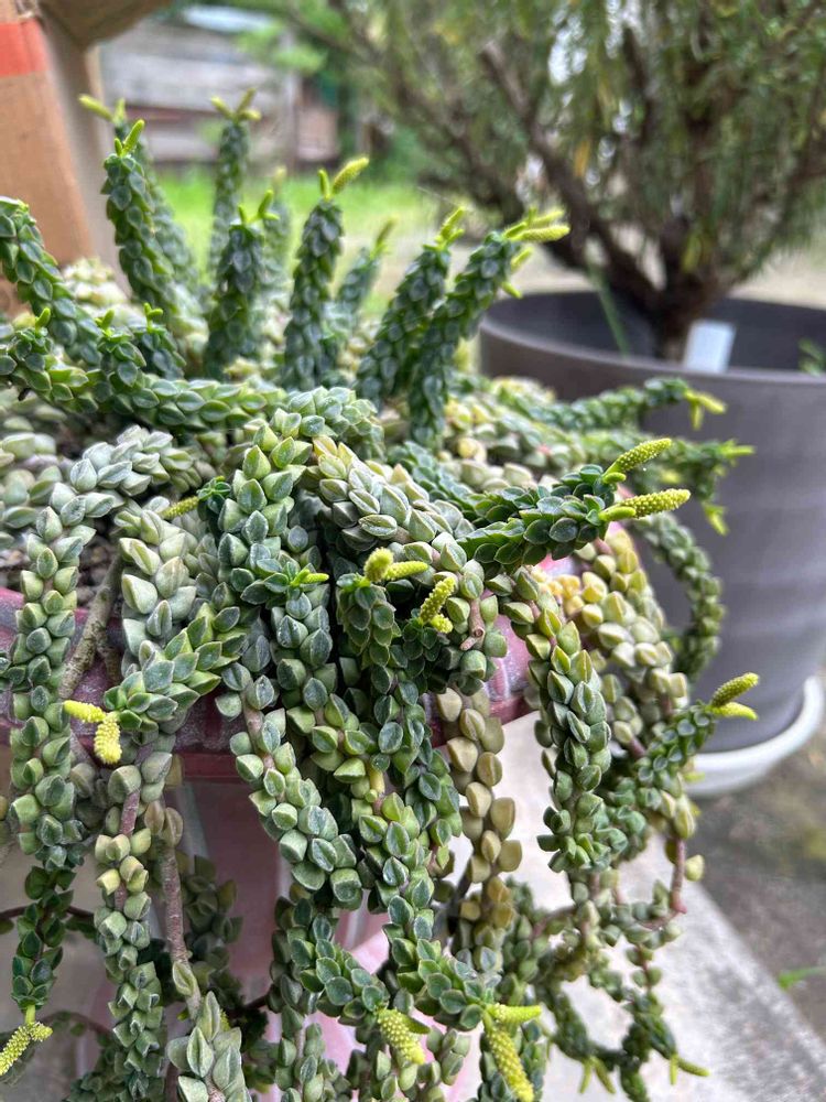 植替えしてお外で元気にお花を咲かせてます。ペペロミアコルメラさん、ニョロニョロ感がたまりません💕💕😅😅
