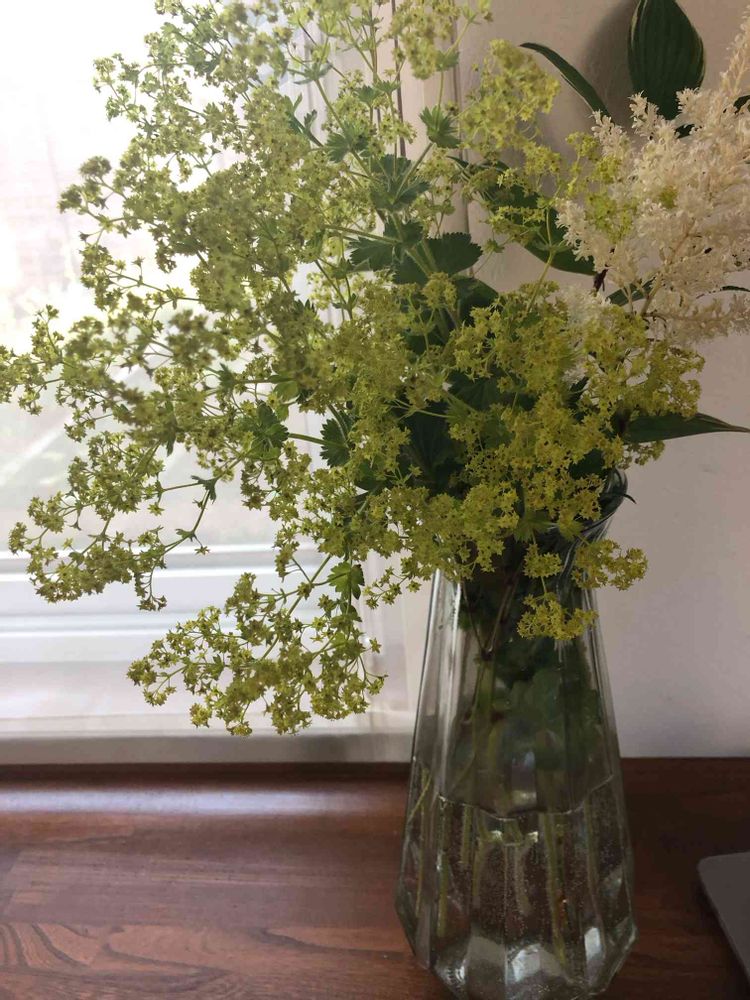 アルケミラモリスとアスチルベでフラワーアレンジしました。