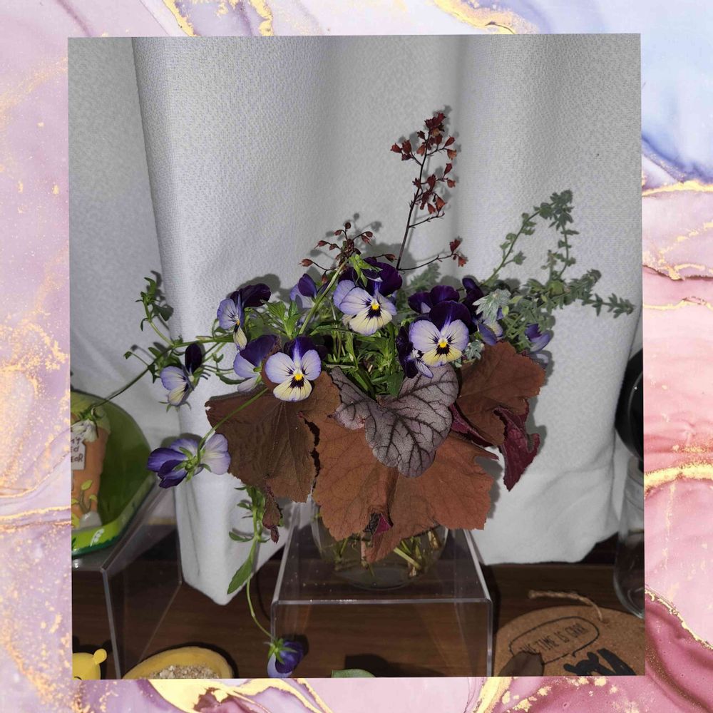 寄せ植えで頑張ってくれていたパンジーさん達のよく咲くスミレさんだけ、ずっとキッチンに来て頑張ってくれているヒューケレラさん&ロータスブリムストーンさんの中に仲間入り😊