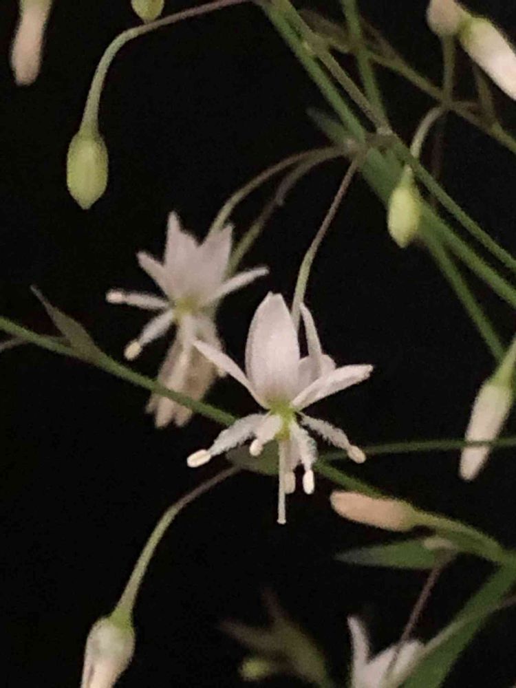 1週間前に、89円園芸店で見つけた 山野草 小町ユリ 小さな白い花が可愛いです♡ 黒いタンスの前で撮りました🤳