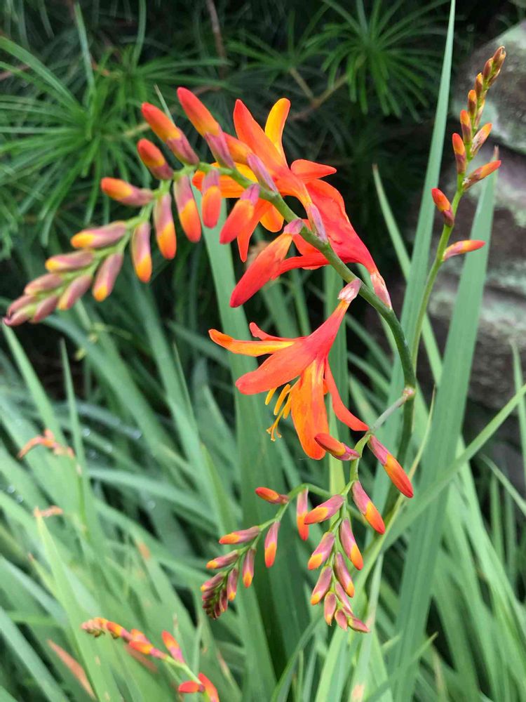 庭の、クロコスミア、別名ヒメヒオウギズイセンの花が、咲き始めました。