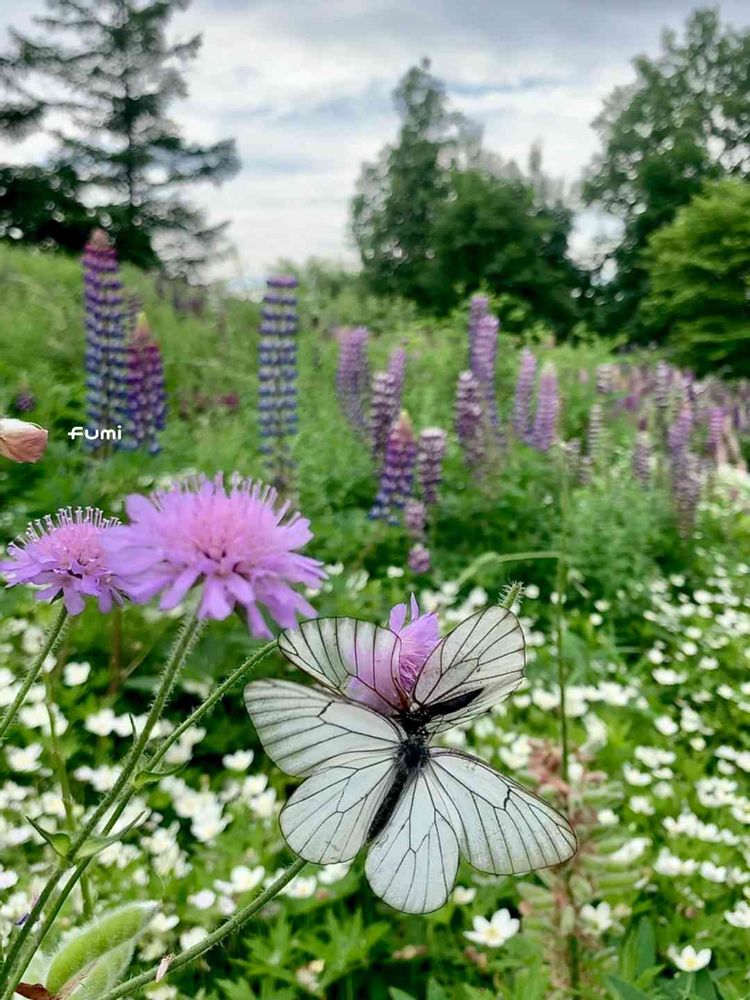 ルピナスが咲く丘の松虫草に、蝦夷白蝶のカップルが、仲良く群れていました