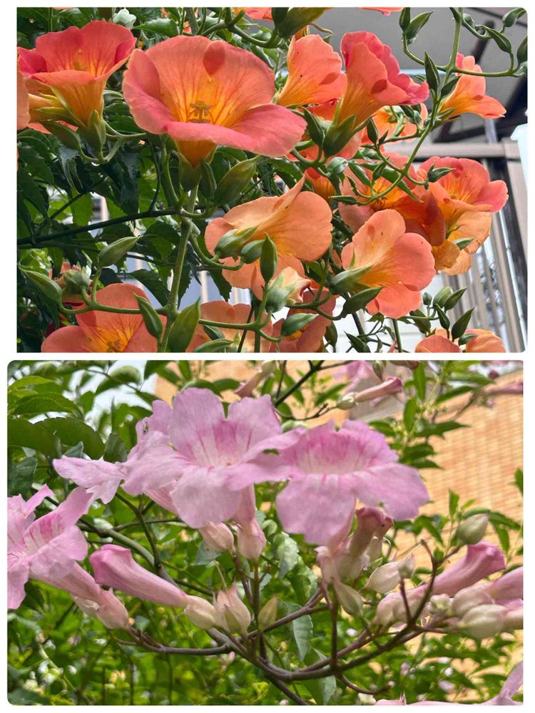 スーパーで友達とバッタリ会い散歩中ピンクノウゼンカツラとオレンジ色のノウゼンカツラがあちこちで咲いていました。