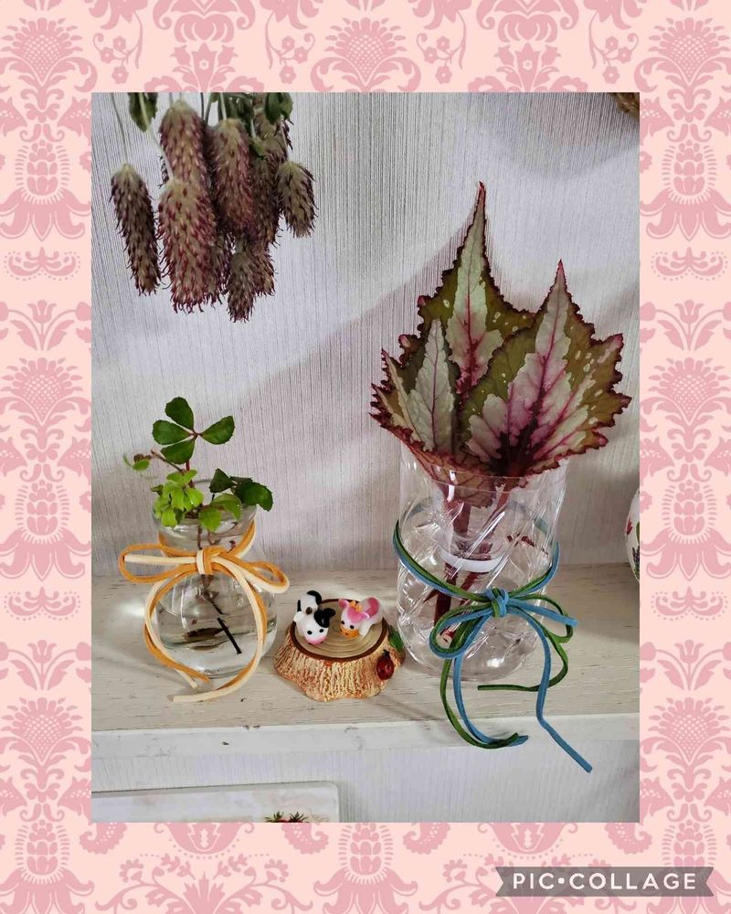 レックスベコニアの色が悪くなったのは日焼けしてしまうと教えて頂き場所替え、葉挿し出きると教えて頂いたので✂️チョンパしてペットボトルに挿して見ました🤗