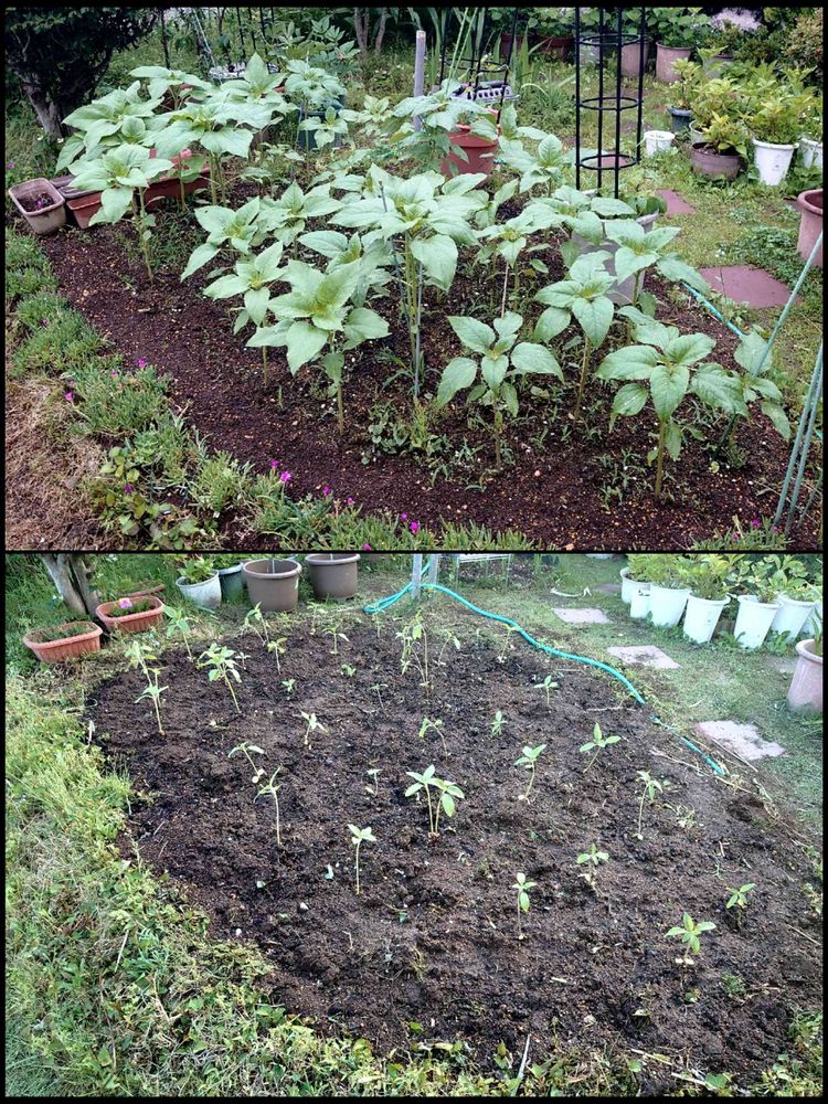6/3にポットから移植したヒマワリたち 3週間で ここまで成長しました🤣 家を訪れる人達皆さん 🌻🌻🌻🌻畑楽しみですねーってプレッシャーをかけてくれます😁😁