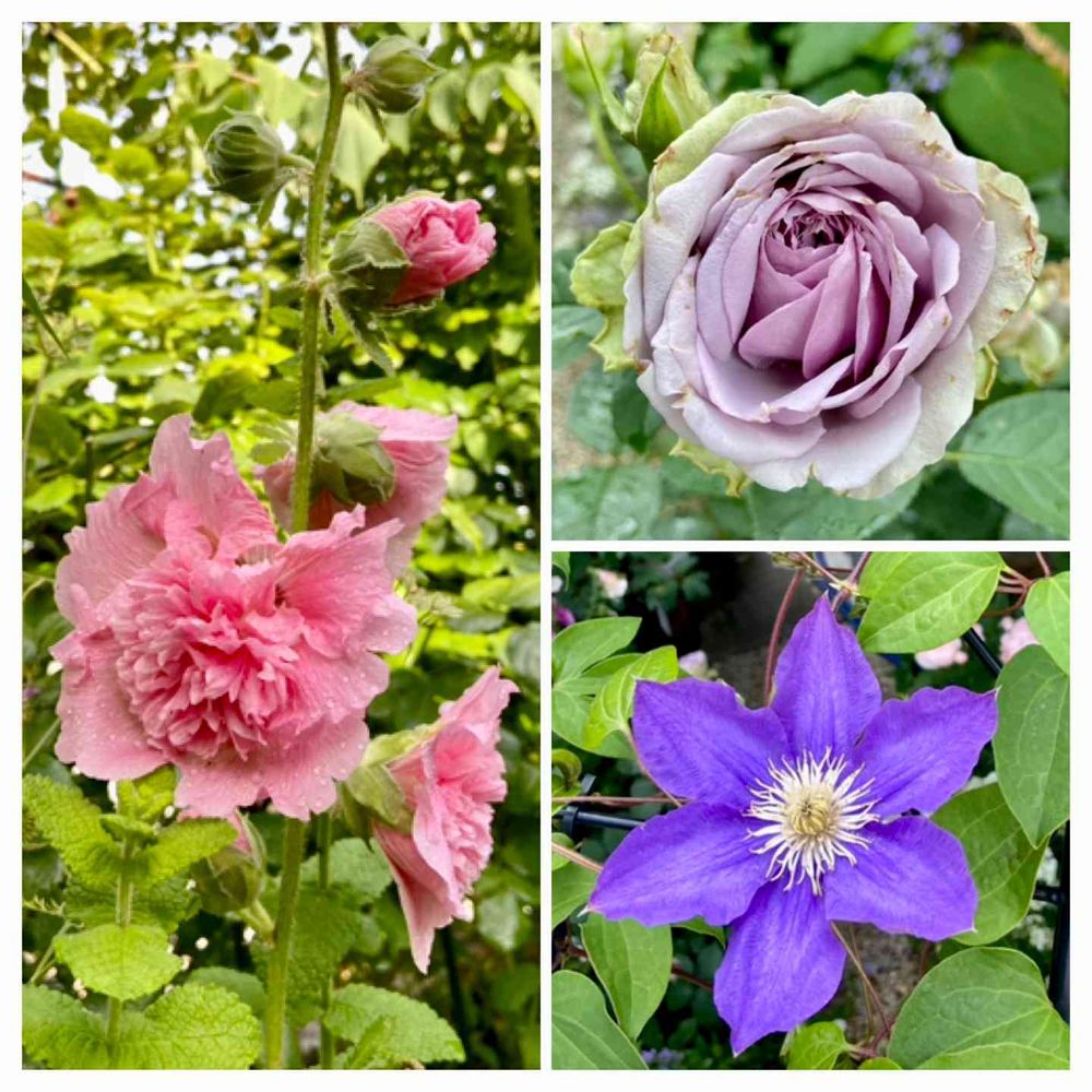 🌸溢れ種から毎年咲いてくれる可愛いタチアオイです❣️🌹コフレもクレマチスも今年迎えた子達🌹コフレは初めに付いた大きな蕾が2つとも🟣完全にボールになって枯れ落ちました💦