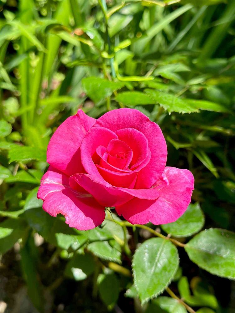 【パローレ】の濃いピンク。先開くと半剣弁高芯咲きに。巨木になるので、花も巨大輪になります。ダマスクの強香種。