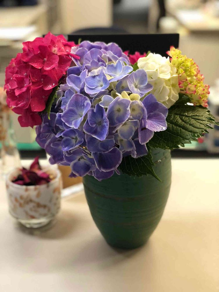 大きな紫陽花があったので、これでもかーってくらいモリモリで生けてみました、