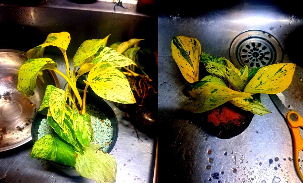 そのまま植え替えても良かったと思うけど、切った枝で根っこと葉っぱが出てるやつを寄せ植えにして1鉢状態にしてたみたいなんで、2枝根っこ付きと分けて、植え替えしたと。 どうせいやでも後からフサフサになるだろうし、別に本当は私、ポトスマニアって程でも・・・・・。