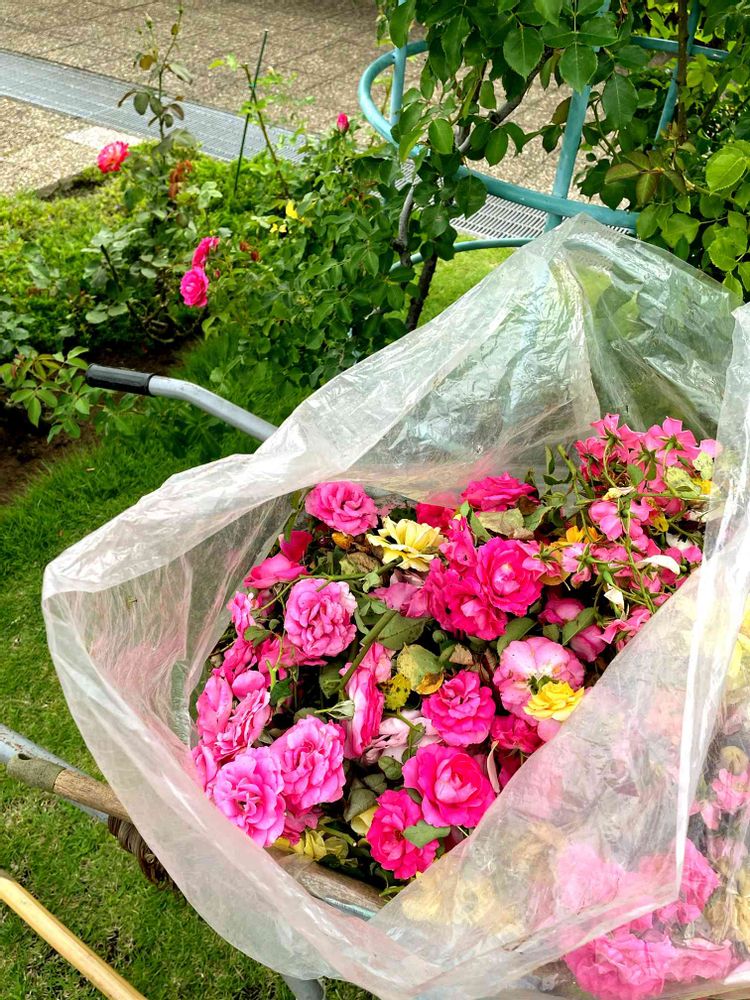 これは、一輪車の上のビニール袋に、たくさんのバラの花が入っている写真