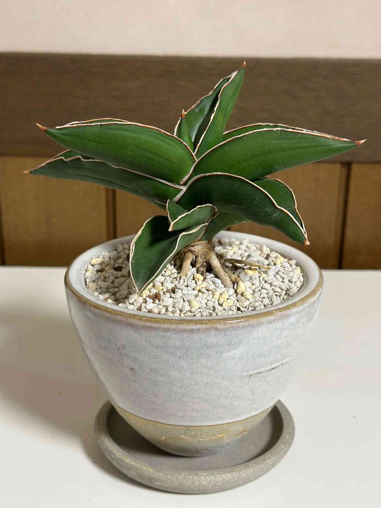 植える時に思いのほか太い根が沢山張っていて、土を入れていくとバネの様にサンスベリア上がってきたので結果根上がり仕立てになりました。