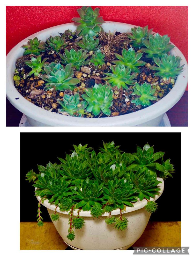 センペルビューム・上は、1月28日投稿から、下は、ランナーを伸ばし、鉢の隙間を埋める程の 現在のセンペルビューム。