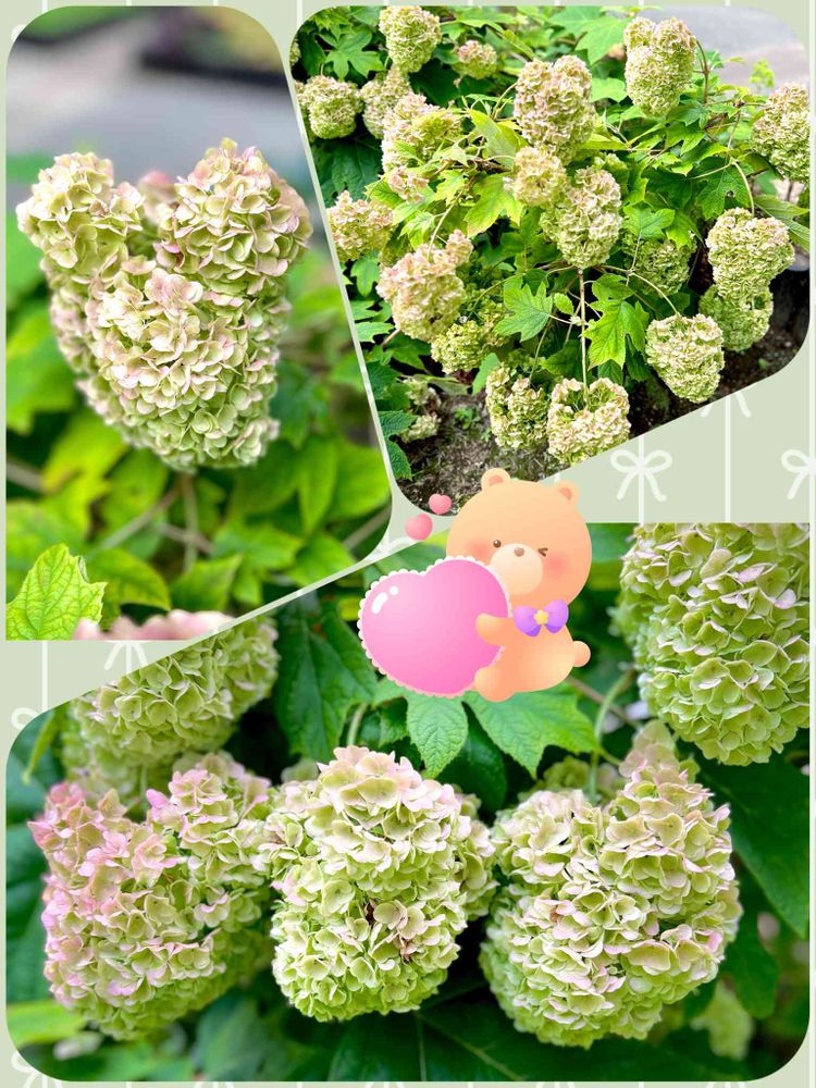 柏葉紫陽花、白い花が緑になりピンクがかってきていました🤍💚💗