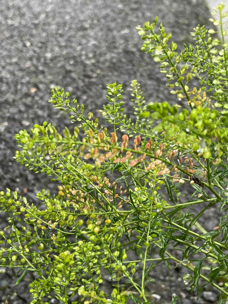 アスファルトの僅かな土に根を下ろすマメグンバイナズナ。
