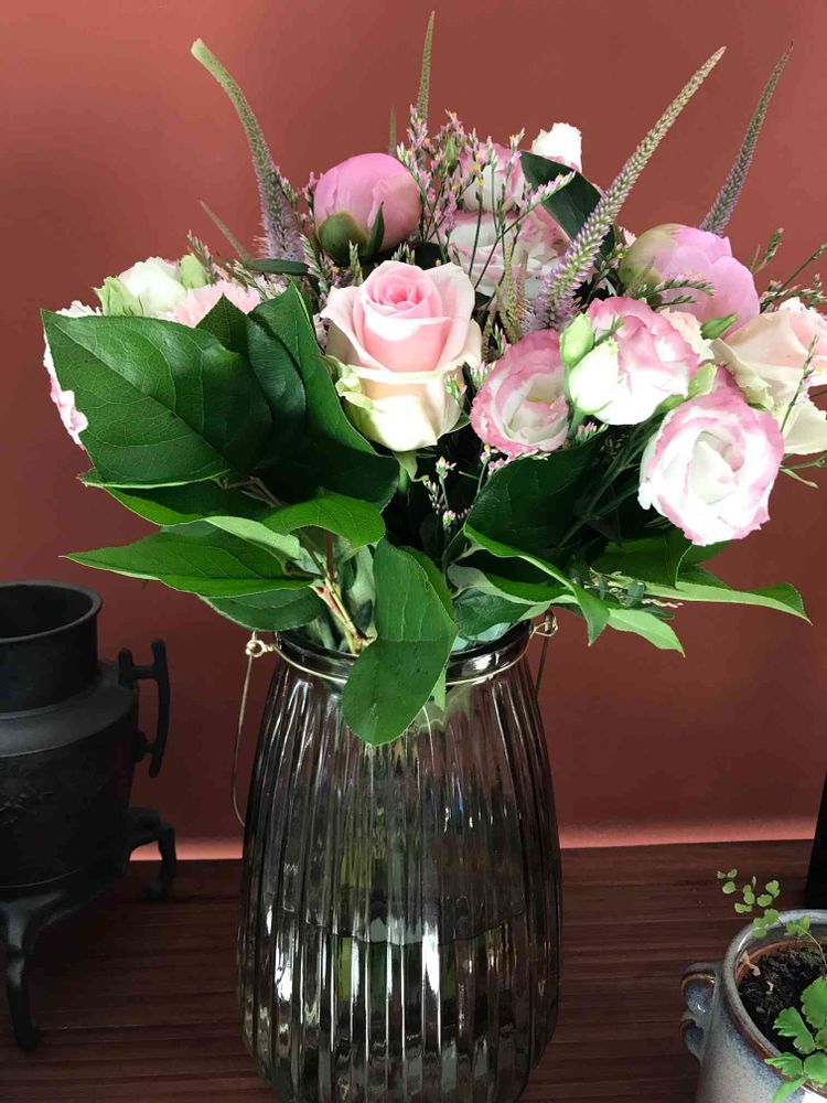 夫のブーケに合う様に花屋さんに行って花瓶を見つけて来ました。大人っぽいシックな感じの花瓶気に入りました。🙂