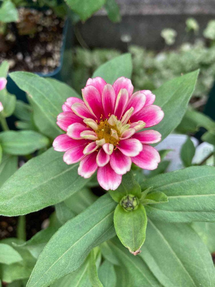 種まきしたジニアザハラダブルラズベリーリップルが咲いてくれました🌸