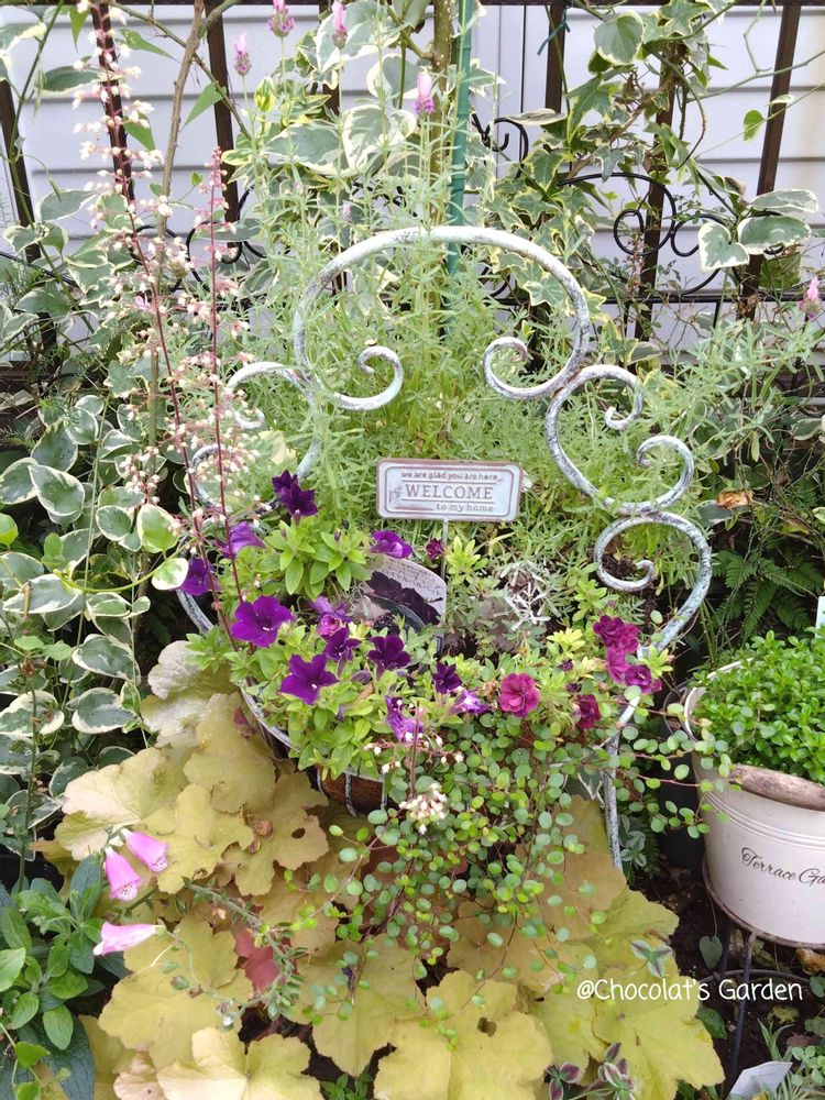 玄関脇の花壇のメインの寄植え。2段のスチール製のスタンドの下段はヒューケラやブラッククローバー、ツルニチニチソウなどの葉物(今はヒューケラがモリモリで他は隠れちゃったけど💦)、上段は手前左側がPWさんのプレゼント🎁に当選したPWスーパーチュニア ロイヤルベルベット、右側はジョルディカワムラのカリブラコアNo.11、奥にピンクのフレンチラベンダーです。