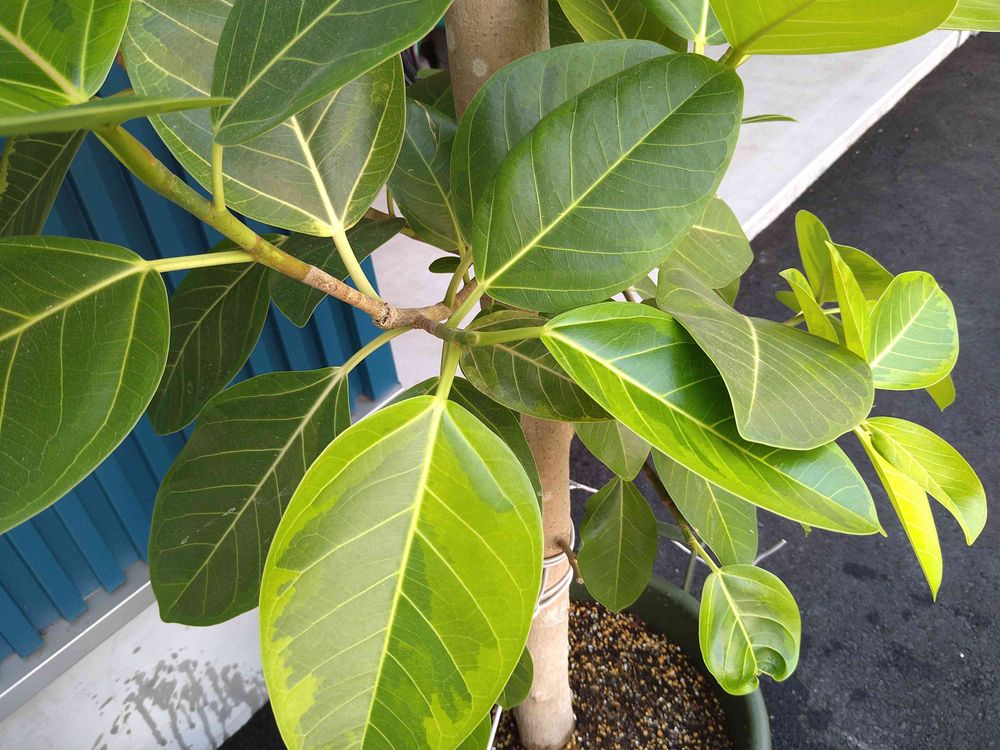 ウチにもダイソーさんでお迎えしたフィカスアルテシマがベランダに出したらどんどん成長しています🤗