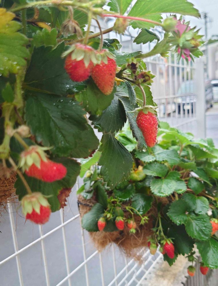 いちご鈴なりです。2年目、四季咲きの赤い花のいちご。