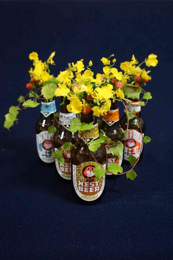 子供から、父の日にプレゼントをされたビールの空き瓶を使って、作品を作りました。