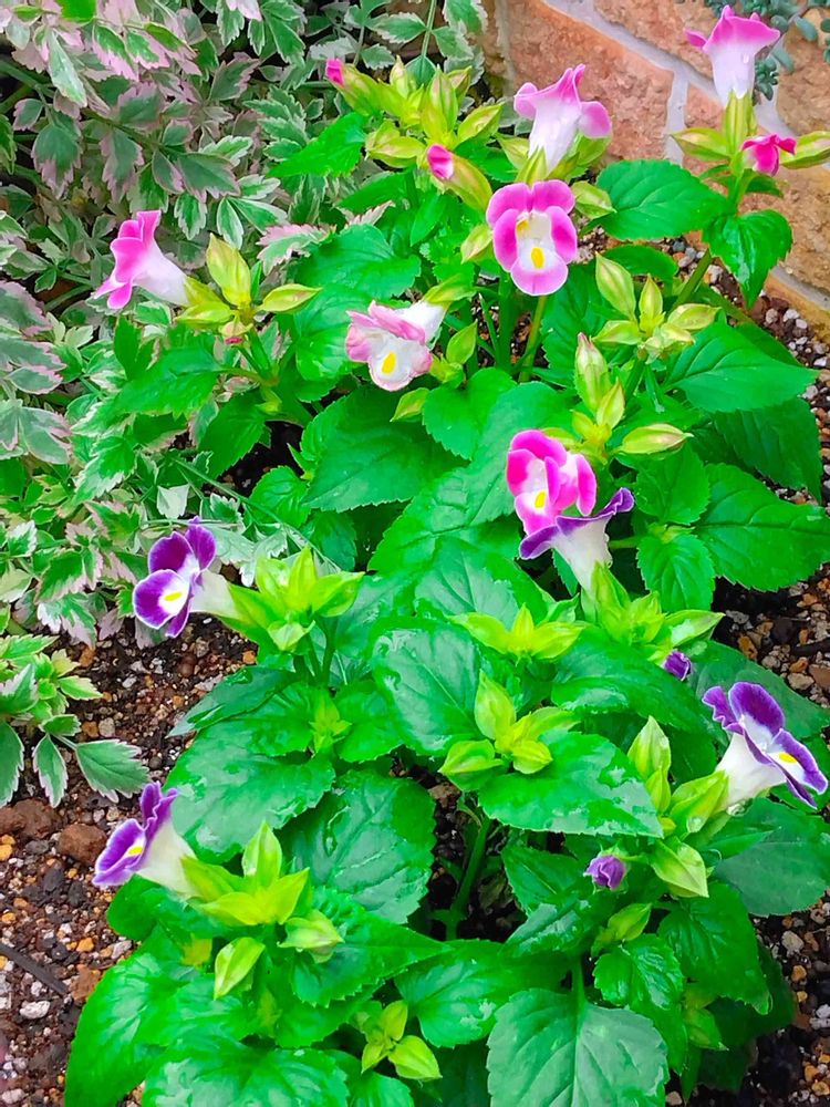 薔薇と宿根草の花壇で、🍀トレニア🍀の紫色とピンク色の花が咲いてます🤗💜💜❤❤🎐