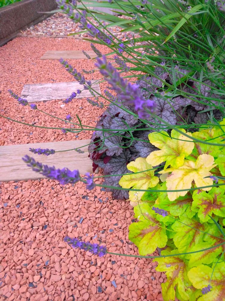 瓦チップの小径の花壇で、🍀ラベンダー グロッソ🍀が可愛い花を咲かせてます💜(ӦvӦ。)💜💜