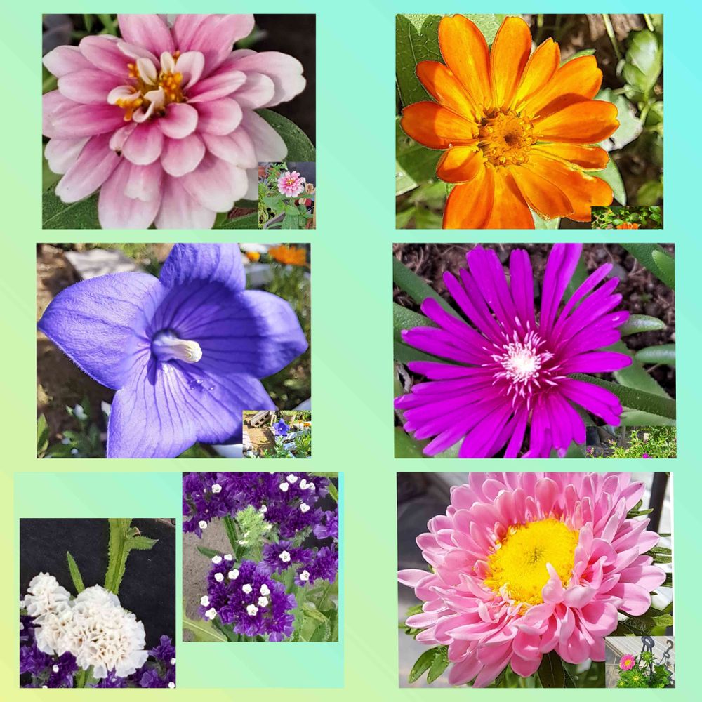 色々咲いています。種からのジニア2種、冬越し出来たキキョウ、マツバギク、苗で購入のスターチス、アスター。たくさん咲いてくれます。