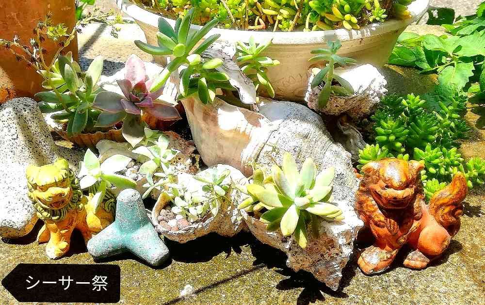 シーサー祭第2投稿。旦那の作った貝殻多肉寄せ植え。