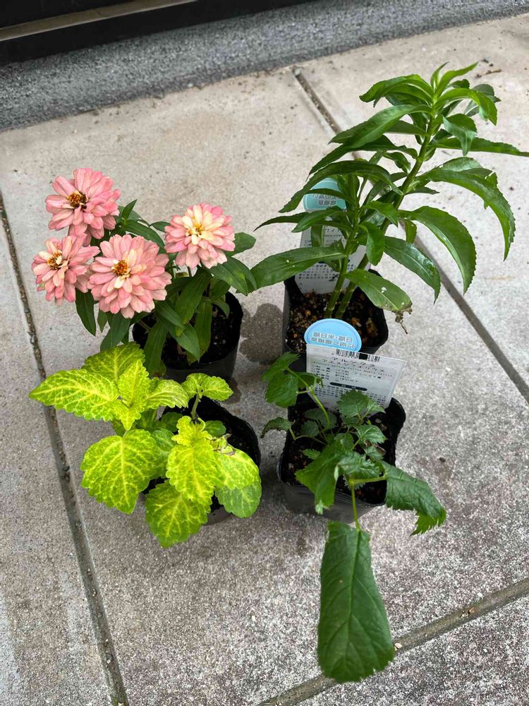 ジニアとコリウスは他のお花と一緒に寄植えしたのですが、コリウスは植え付けのときに根を崩してしまったのか1日経ってもグッタリ。。。やってしまった😭