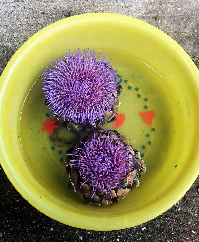 収穫が遅くなり、開花してしまったアーティチョーク。